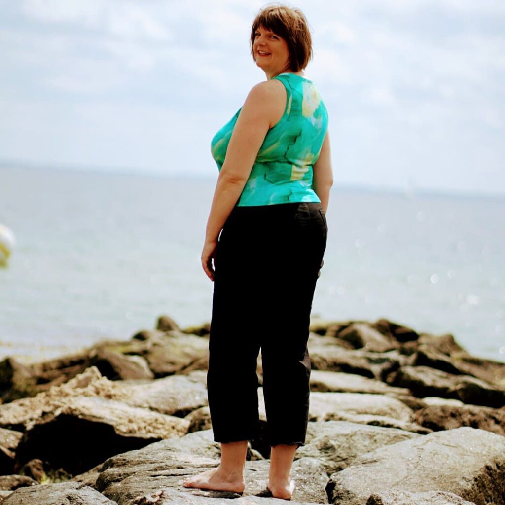 Dieses Outfit ist komplett me made. Das Tanktop ist ein kostenloses Schnittmuster, das Blomma Tank, was es gibt, wenn man den Newsletter von Paradise Patterns abonniert. Ich war auf der Suche nach einem Schnitt, der wenig Stoff braucht, weil ich hier noch einen Stoffrest hatte. Und so entstand dieses Oberteil. Ich liebe den Stoff sehr. Er erinnert mich total an das Meer und die Wellen. Deswegen wollte ich es auch unbedingt am Strand fotografieren.